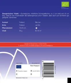 Eine feine, kräftig grüne Bohne mit 8 – 9 mm Durchmesser und 12 – 13 cm Länge. Schöne, wohlgeformte Hülsen. Samenfest.