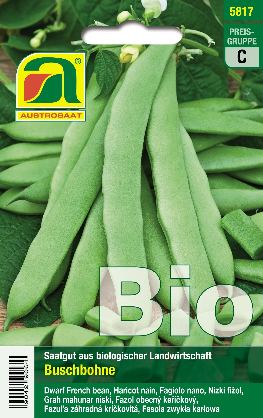 Eine robuste, fadenlose Schwertbohne mit flachen, grünen Hülsen.