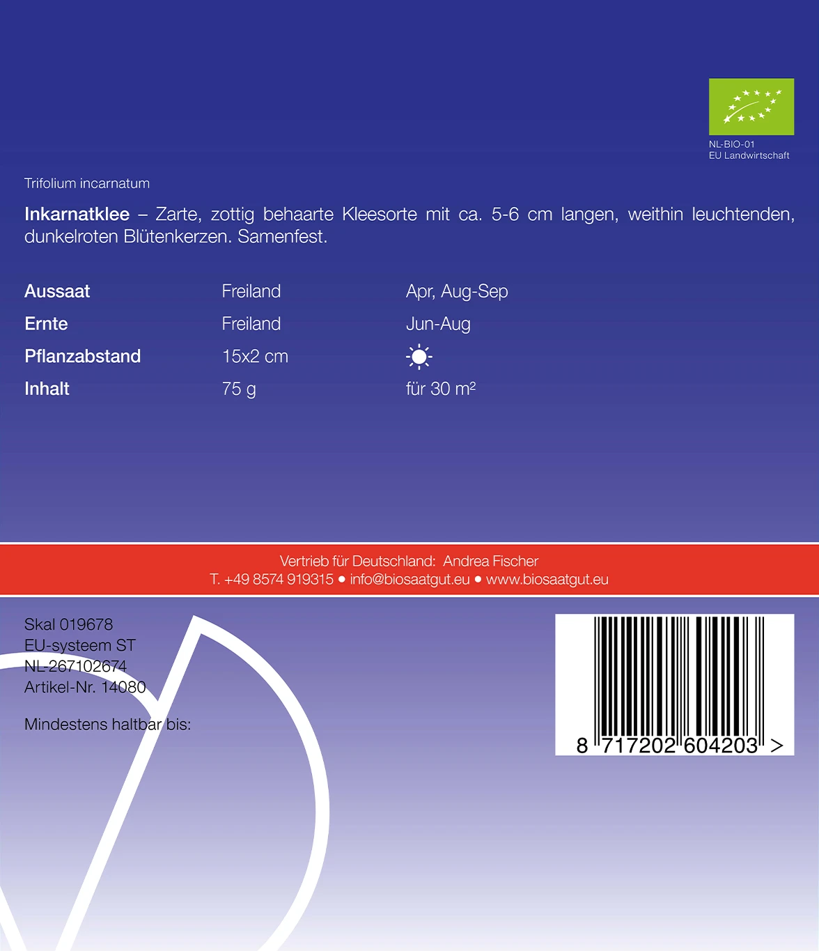 Zarte, zottig behaarte Kleesorte mit circa 5 – 6 cm langen, weithin leuchtenden, dunkelroten Blütenkerzen. Samenfest.