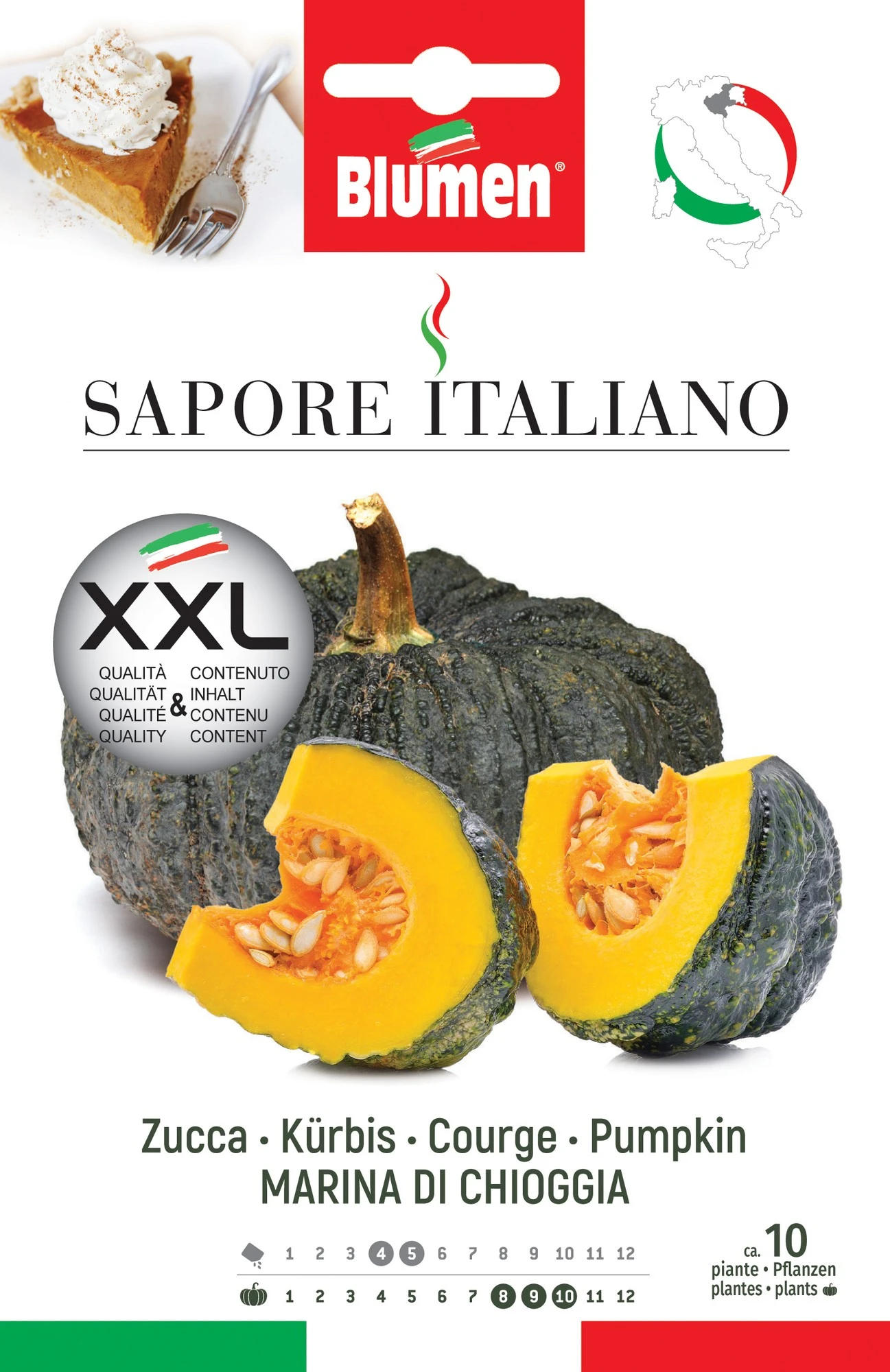 Kräftige Pflanze, mittelgrüne Blätter. Runde, große, leicht zerquetschte Form (5-10 kg). Dunkelgraue Schale mit deutlicher Scheibentrennung. Oranges Fruchtfleisch.