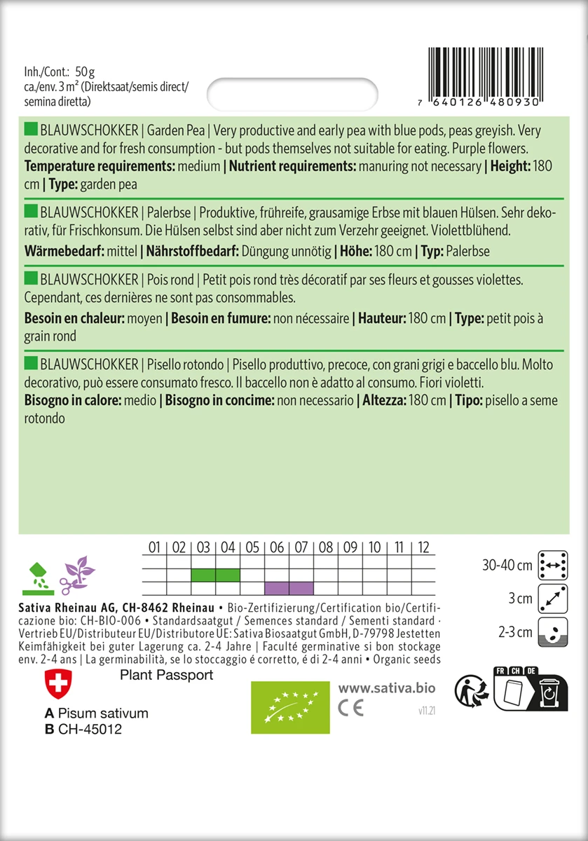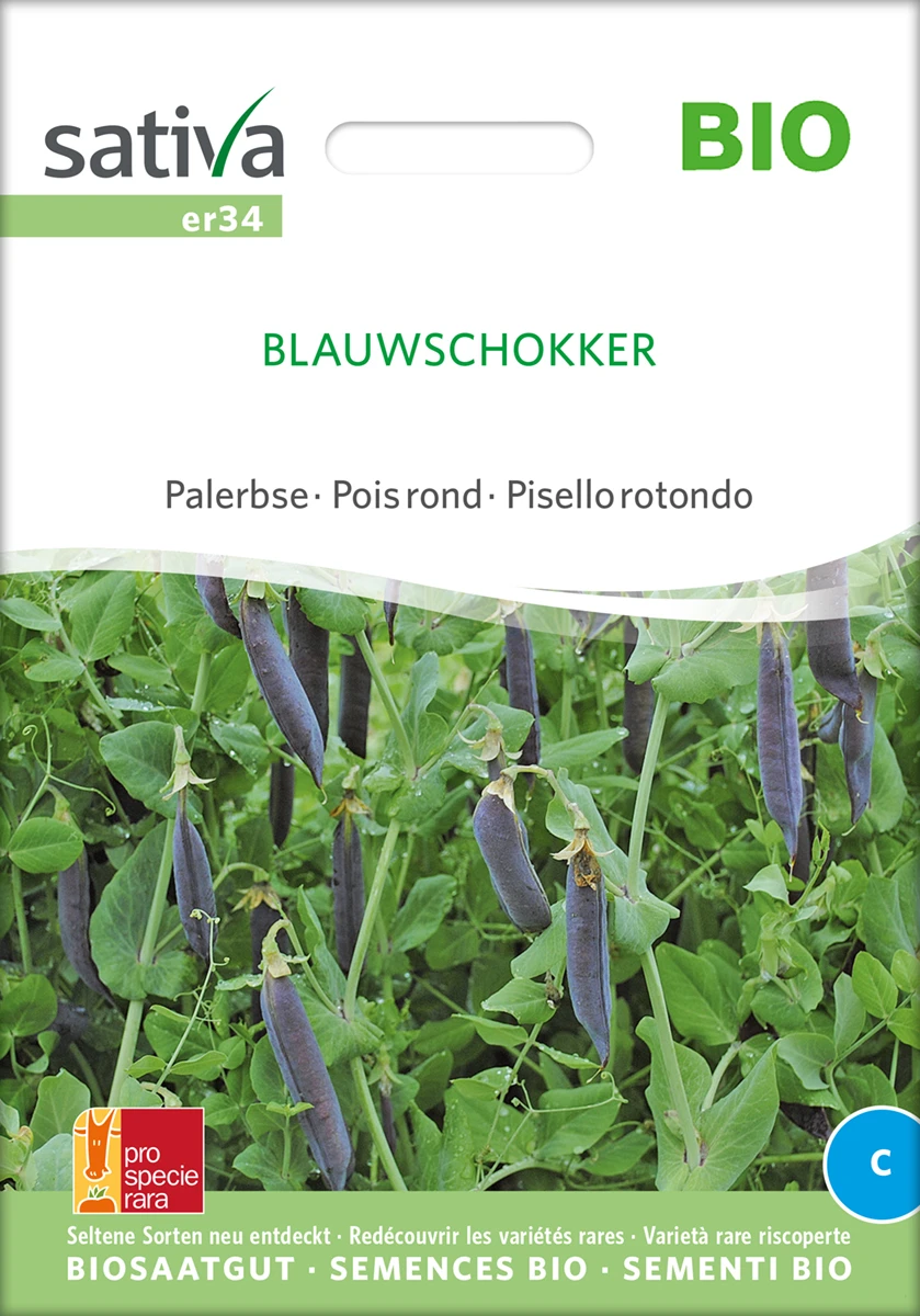 Produktive, frühreife, grausamige Erbse mit blauen Hülsen. Sehr dekorativ, für Frischkonsum. Die Hülsen selbst sind aber nicht zum Verzehr geeignet. Violettblühend.