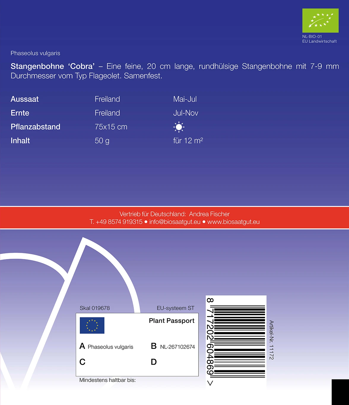 Eine feine, 20 cm lange, rundhülsige Stangenbohne mit 7 – 9 mm Durchmesser vom Typ Flageolett. Samenfest.