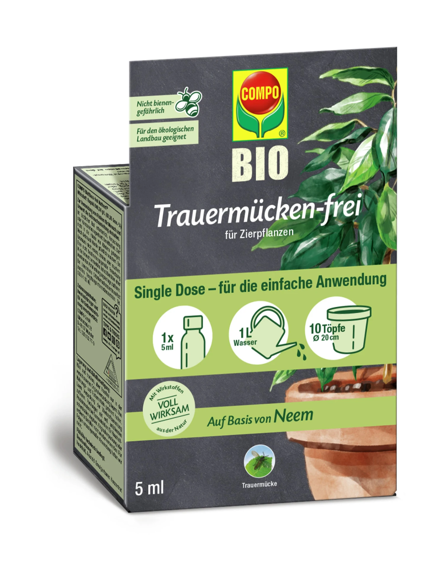 COMPO Trauermücken-frei ist ein Bioinsektizid mit dem kraftvollen, natürlichen Wirkstoff aus dem indischen Neembaum. Es zeigt eine sehr gute Wirkung gegen Trauermücken-Larven an Zierpflanzen, welche die Wurzeln der Pflanzen nachhaltig schädigen. Somit wird auch die Population der fliegenden Trauermücken nachhaltig bekämpft. Auch andere saugende, beißende und blattminierende Schädlinge werden zuverlässig beseitigt. Die praktische Portionsflasche erspart komplizierte Umrechungen oder Dosierungen. Das COMPO Trauermücken-frei ist nicht bienengefährlich und auch für den ökologischen Landbau zugelassen.